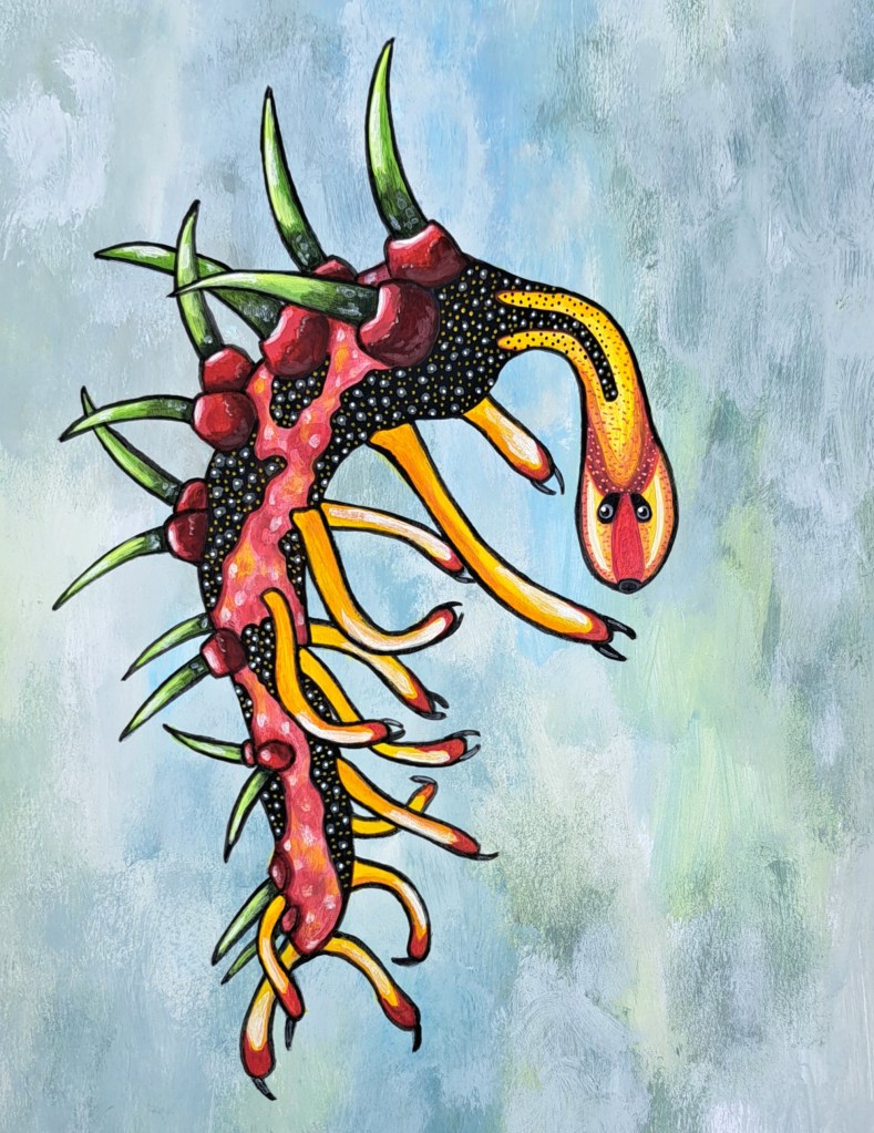 Next is Danielle Dufault, a Canadian biologist and paleologic illustrator. She hosts the Animalogic Channel on YouTube and does her own illustrations, including digital drawing. Her work is not only an act of expression, it has to be exact because she is portraying reconstructions of real animals that once lived. My rendition is much less exact, of course, because I do not have the biology background that tells me when things are right or wrong. This is based on a fossil creature called Hallucigenia.