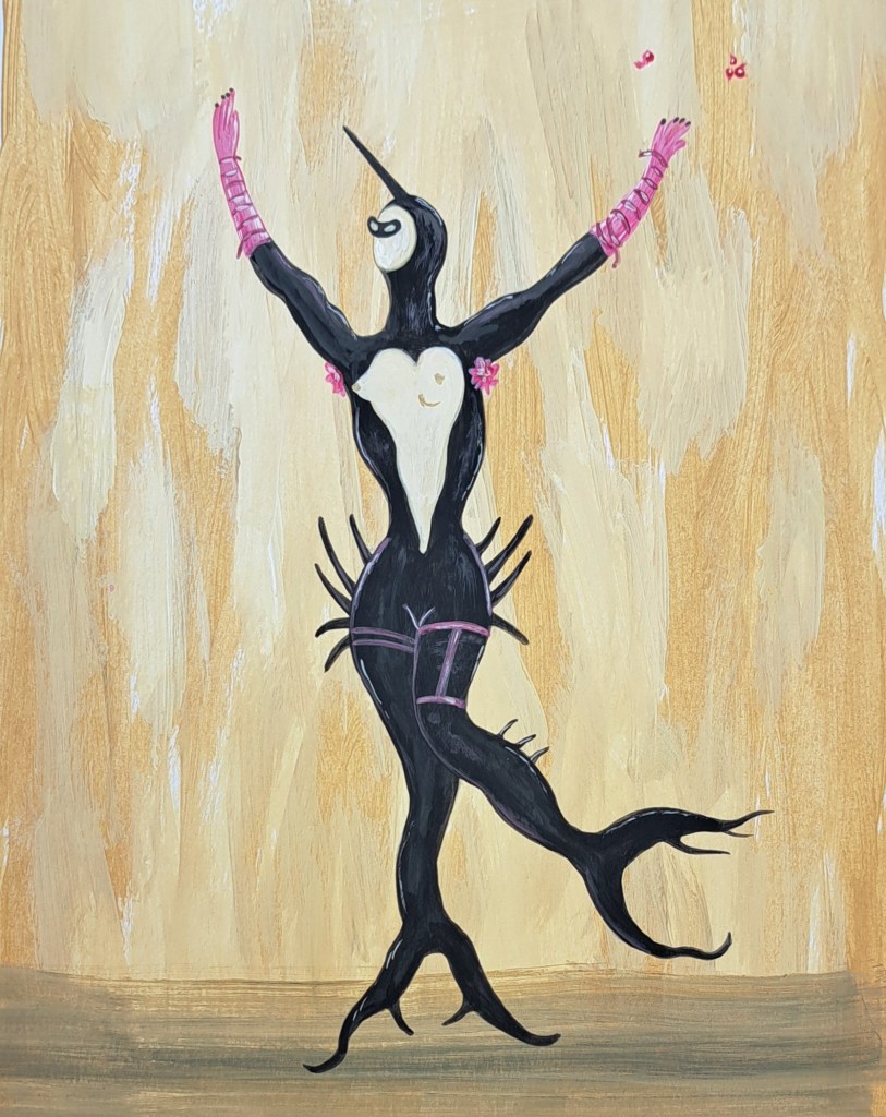 First is an imitation of Dali himself. This is based on his Masked Mermaid in Black, completed in 1939. So many of his images swirl constantly around my heart, but for this one he worked in gouache, which is a relatively similar medium to my acrylics, so that’s why I chose it.
