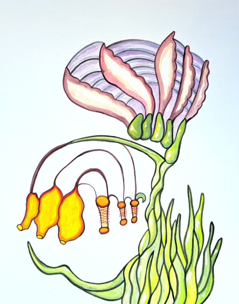 Next is Anna Zemánková. Her plants–wow. She painted a lot of pieces and I don’t think any of them were real plants. But they didn’t have to be, they are so distinctive and beautiful. This is based on an untitled and undated piece which I originally saved years ago. I almost never work on plain white (uncolored, unprepped) backgrounds so this was challenging. I kept thinking, “no room for mistakes” then realized that there are no mistakes when your plants aren’t real anyway.