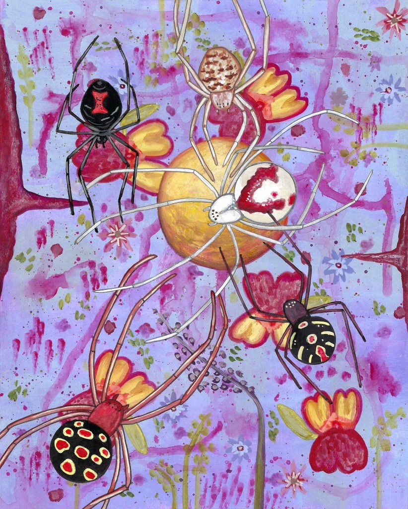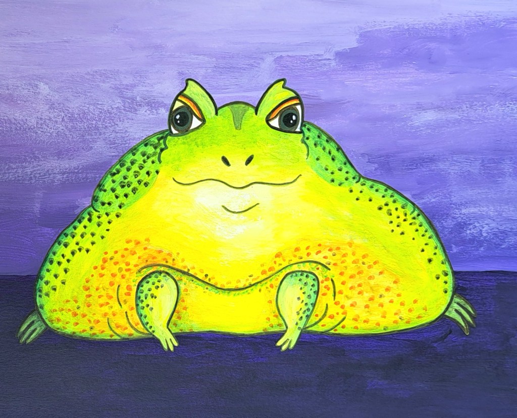 Next is a close friend who is also an artist. She frequently sends me drawings of frogs and I fell in love with this great big fat one, originally done in alcohol markers. I think I was able to get the blotting effect captured relatively well in acrylics, but I kept returning to the thought of how much medium actually matters. No medium is perfect for all applications, but when you compare them you can really tell the difference.