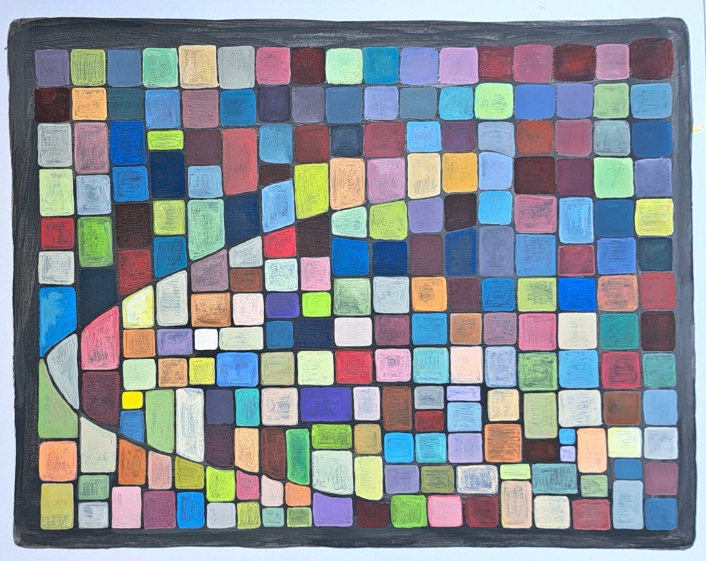 Paul Klee (pronounced “clay”) is next. This guy is another artist that I find a bit difficult to understand, but that causes me to keep returning to his work. I think he worked in crayons or pastels and his work often has a playful quality to it, even though a lot of the colors can be smudged or dark on purpose. This is based on “May Picture” from 1925. It became a guppy as I worked on it.