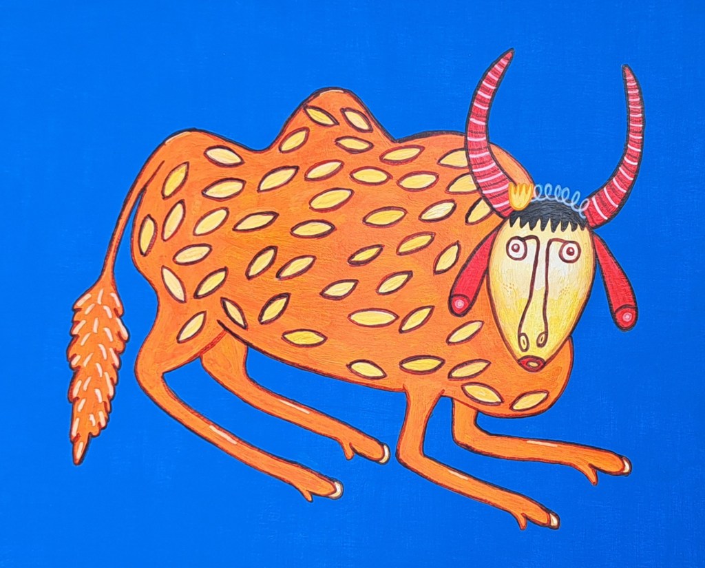 Next is Maria Primachenko. I’ve seen her work described as “imaginative” but I don’t think that goes far enough. I would call it bright, clean, proud. She’s one of several Ukrainian artists whose work I immediately recognize. Her animals are often curious-looking both in the way they look curious to the viewer, but their expressions show a kind of curiosity as well. This was based on Ukrainian Bull, Three Years Old, Went Walking Through the Woods and Garners Strength from 1983.