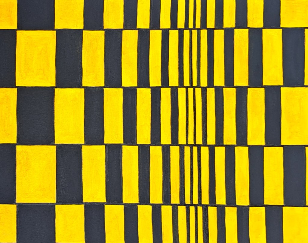 Second is Bridget Riley, an artist whose work I can find a bit indecipherable and cold. But I don’t mean that in a bad way, as these aspects make her art intriguing to me. It somehow feels foreign, as though the sterile geometric repetition and sharp lines hide a message that I can’t quite access because I’m too used to painting soft, fuzzy, flowers. And she actually works in acrylic. This is based on her “Movement in Squares.” It proved to be much more difficult than it looks. It gave me appreciation for the technical skills something like this actually requires.