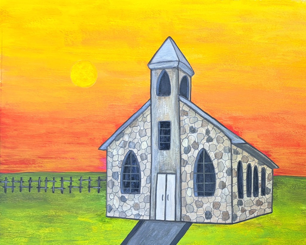 I decided to complete a series of imitations based upon pieces of art that have stayed with me for one reason or another. Each of these is done on 8 inch by ten inch paper in acrylics and other media as noted. Each one is much closer to my own style, but I tried to incorporate what elements I could from the originals.