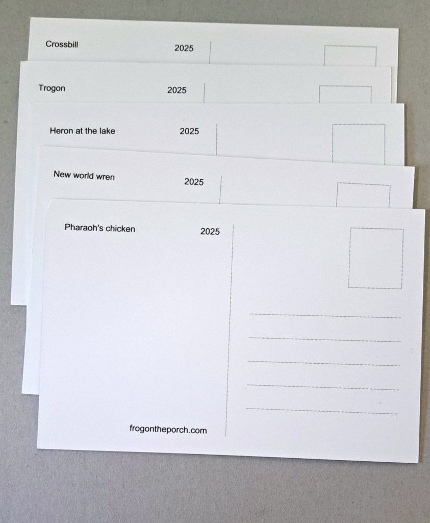 Set of five (5) postcards of bird paintings that I have completed over the years, 4 inches by 6 inches each. Can be used as actual postcards, displayed as art, or used as a wide bookmark (that’s what I do). They can also be given as a gift.